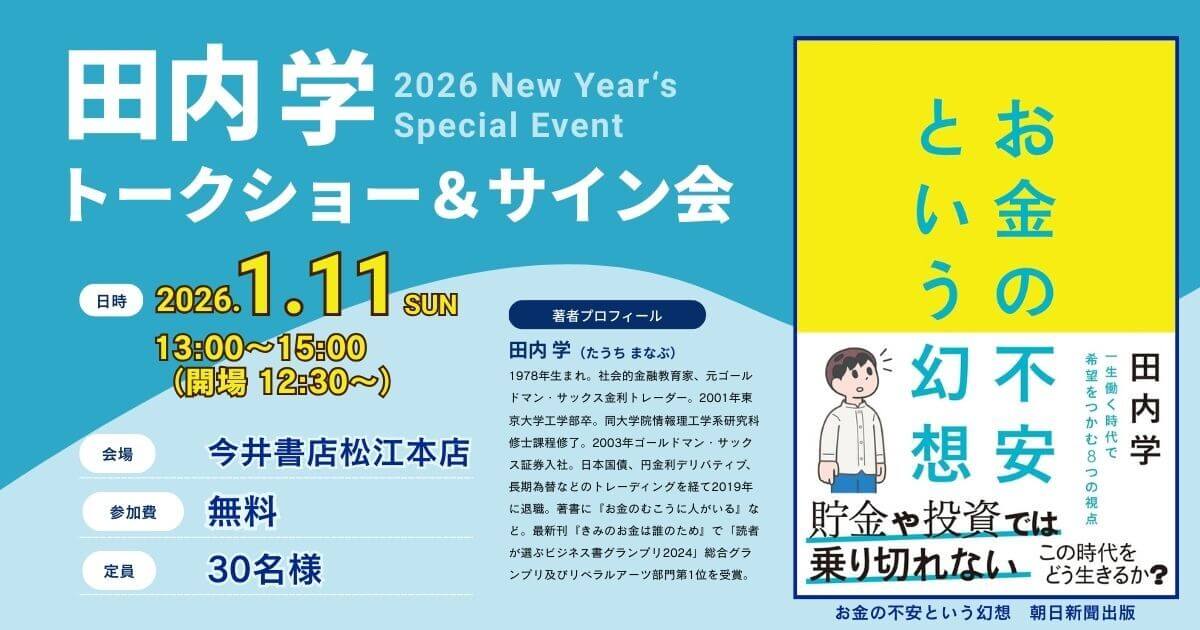 2026年New Year Special Eventとして、今井書店松江本店で『お金の不安という幻想』の著者、田内学さんのトーク&サイン会を開催いたします。